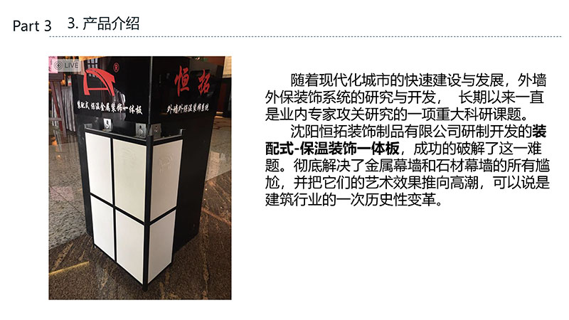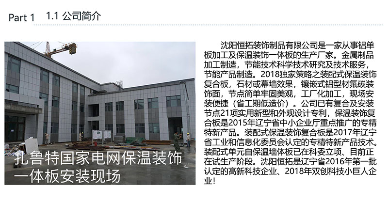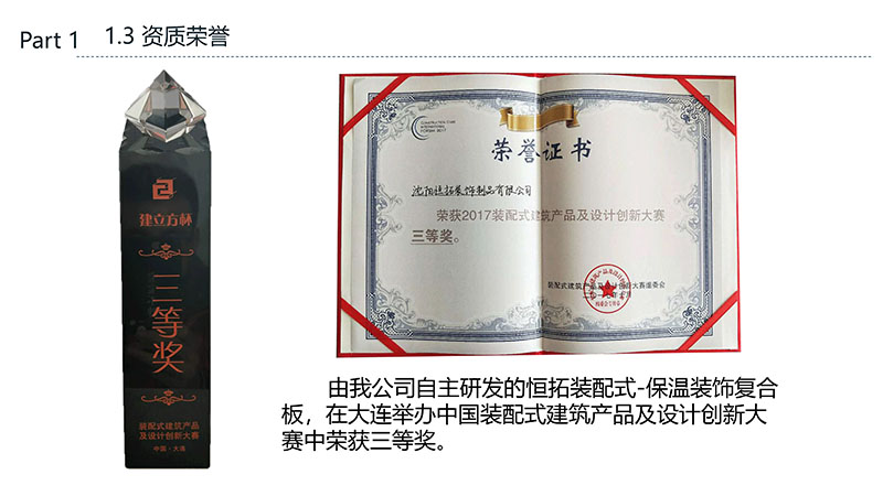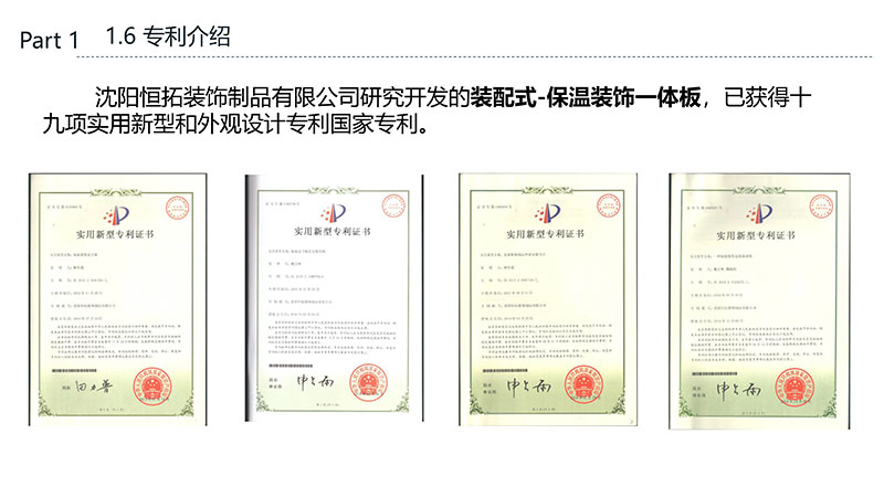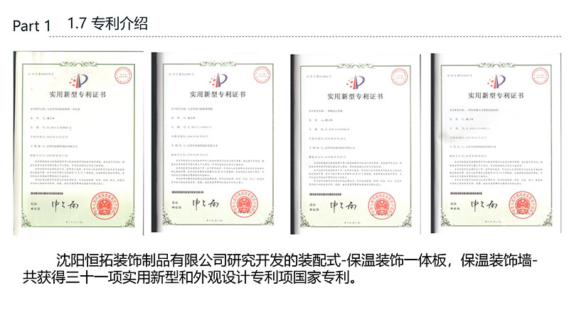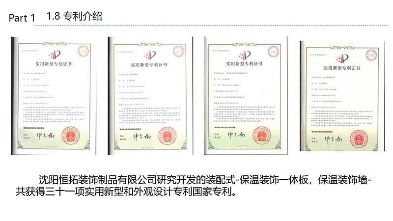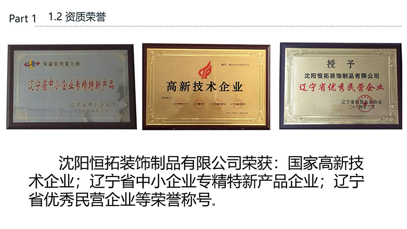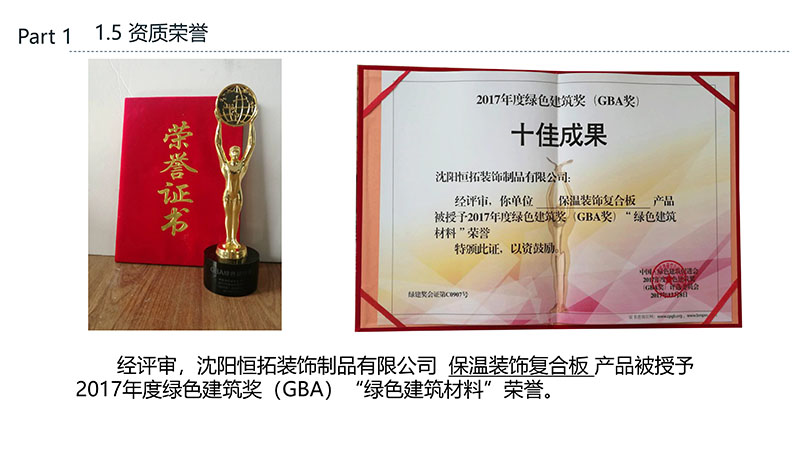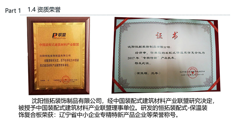保溫裝飾一體化板的沈陽恒拓裝飾制品有限公司經中國裝配式建筑材料產業聯盟研究決定,被授予中國裝配式建筑材料產業聯盟理事單位,研發的恒拓裝配式保溫裝飾復合板榮獲遼寧省中小企業專業特新產品企業等榮譽稱號。